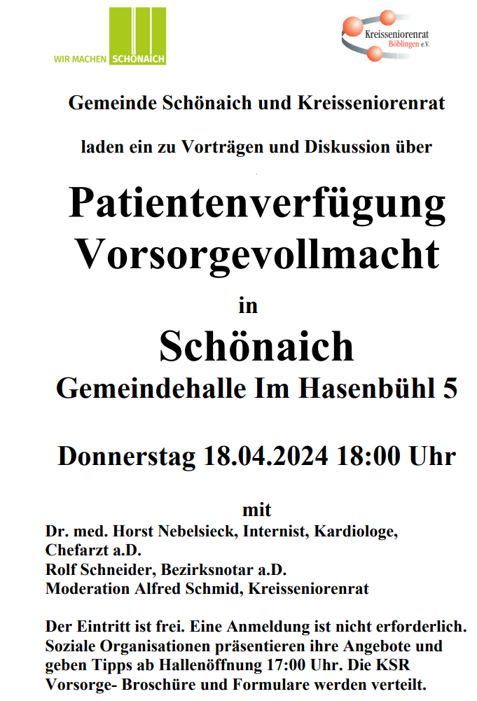 18. April 2024 – Veranstaltung ‚ Vorsorgende Verfügungen‘ in Schönaich Beitrag veröffentlicht:28. Februar 2024 Beitrags-Kategorie:Aktuelles Das könnte dir auch gefallen Mit mir nicht ! – Veranstaltung zum Thema Enkeltrick – 25.10.2023 in der Murkenbachaula – Böblingen 23. Oktober 2023 Neue Betriebe als ‚Seniorenfreundliche Handwerker‘ zertifiziert 1. Dezember 2024 Wie fühlt sich Demenz an? 23. September 2024