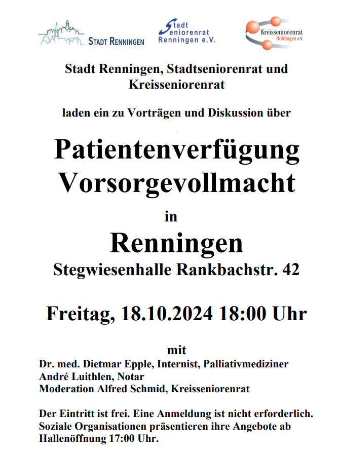 18. Oktober 2024 (18 Uhr) – Veranstaltung ‚Vorsorgende Verfügungen‘ in Renningen Beitrag veröffentlicht:7. Oktober 2024 Beitrags-Kategorie:Aktuelles Das könnte dir auch gefallen Bürokratieabbau ja – aber nicht auf Kosten von Schutz, Würde und Mitbestimmung 7. Januar 2026 Interview Manfred Koebler zum Thema Vorsorgende Verfügungen (KZ Böblingen – 18.10.2023) 18. Oktober 2023 Neue Handreichung für den Einsatz des Notfallbogens in Pflegeeinrichtungen 5. Juni 2025