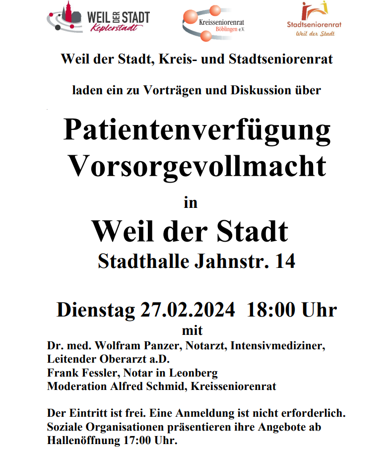 27.2.2024 – Veranstaltung in Weil der Stadt – Vorsorgevollmacht & Patientenverfügung Beitrag veröffentlicht:5. Februar 2024 Beitrags-Kategorie:Aktuelles Das könnte dir auch gefallen Informationen zu Vorsorgevollmacht und Patientenverfügung (Volksbank Böblingen – 17.4.2024) 18. April 2024 Vortrag ‚Leistungen der Sozialsysteme‘ am 14.7.2025 7. Juli 2025 ‚Wenn das Leben zur Last wird ‚ – Veranstaltung des Krisentelefons am 20. Oktober 2025 5. Oktober 2025