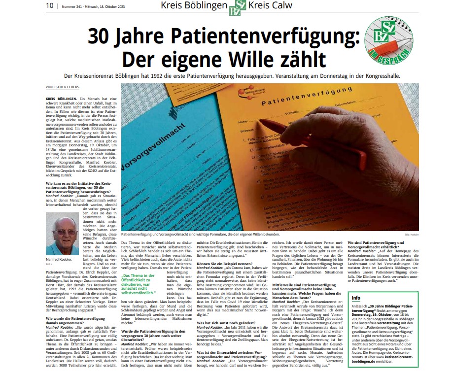 30 Patientenverfügung – Artikel vom 18.10.2023 – SZBZ Beitrag veröffentlicht:23. Oktober 2023 Beitrags-Kategorie:Aktuelles / Presse Das könnte dir auch gefallen Veranstaltung zu ‚Vorsorgenden Verfügungen‘ am 20.3.2026 in Jettingen 3. Februar 2026 Wertschätzende Kommunikation für Menschen mit Depression und Demenz – Vortrag 16. Juli 2024 im Landratsamt Böblingen 8. Juli 2024 Ambulante Hospizdienste im Kreis Böblingen – Begleitung Sterbender und ihrer Angehöriger 9. September 2023