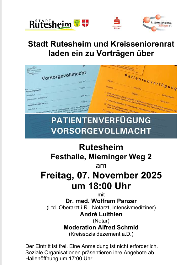 Einladung zur Veranstaltung ‚Vorsorgende Verfügungen‘ am 7.11.2025 in Rutesheim Beitrag veröffentlicht:13. Oktober 2025 Beitrags-Kategorie:Aktuelles Das könnte dir auch gefallen Vorsorgende Verfügungen – Volle Stadthalle in Weil der Stadt 25. März 2024 Wie fühlt sich Demenz an? 23. September 2024 30 Jahre Böblinger Patientenverfügung – Informationsveranstaltung am 19. Okt. 2023 in Böblingen zu „Patientenverfügung, Vorsorgevollmacht, Betreuungsverfügung“ 13. Oktober 2023