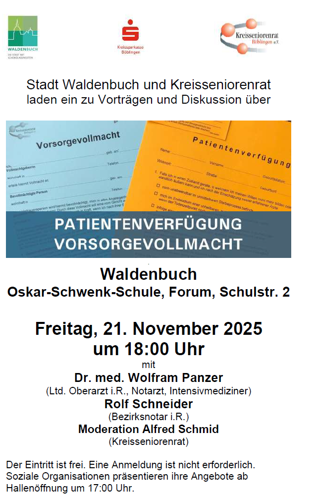 Einladung zur Veranstaltung ‚Vorsorgende Verfügungen‘ am 21.11.2025 in Waldenbuch Beitrag veröffentlicht:5. November 2025 Beitrags-Kategorie:Aktuelles / Startseite Das könnte dir auch gefallen Hilfe zur Pflege kann finanzielle Entlastung bringen – Teil 1 9. Januar 2026 Die ‚eigenen 4-Wände‘ fit machen für Einschränkungen im Alter 23. Januar 2025 Informationen zu Vorsorgevollmacht und Patientenverfügung (Ehningen – 17.3.2025) 17. März 2025