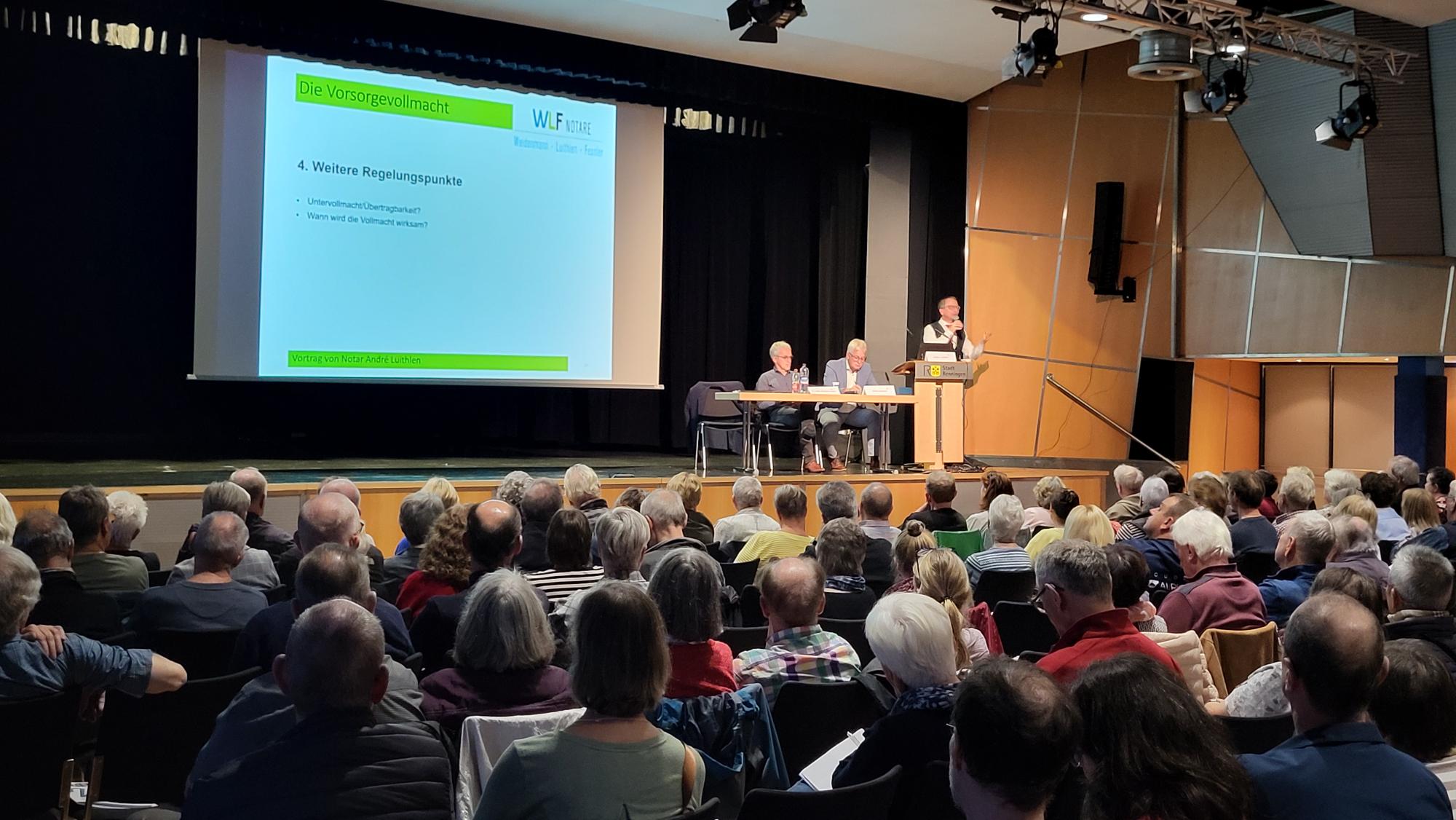 Dr. med Dietmar Epple, Notar Andre Luithlen für die kompetenten Vorträge zur Patientenverfügung und Vorsorgevollmacht, sowie Alfred Schmid für die Moderation der Veranstaltung und allen Kooperationspartnern, die mit ihren Infoständen im Foyer wertvolle Informationen rund um das Thema ‚Leben im Alter‘ vermittelt haben!