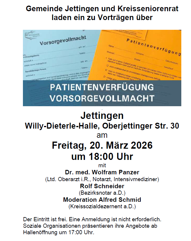 Veranstaltung zu ‚Vorsorgenden Verfügungen‘ am 20.3.2026 in Jettingen Beitrag veröffentlicht:3. Februar 2026 Beitrags-Kategorie:Aktuelles / Startseite Das könnte dir auch gefallen Wertschätzende Kommunikation für Menschen mit Depression und Demenz – Vortrag 16. Juli 2024 im Landratsamt Böblingen 8. Juli 2024 „Stopp! Mit mir nicht“ – Selbstbehauptung für Senior*innen 5. Februar 2024 Neue Handreichung für den Einsatz des Notfallbogens in Pflegeeinrichtungen 5. Juni 2025