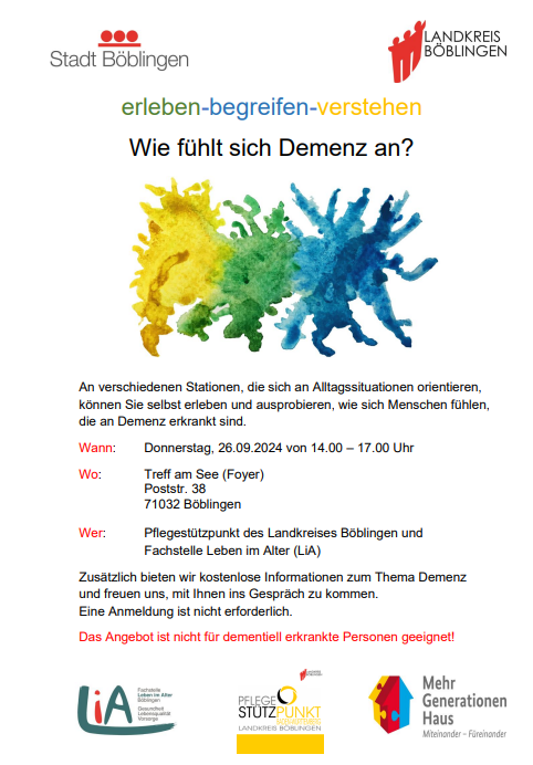 Wie fühlt sich Demenz an? Beitrag veröffentlicht:23. September 2024 Beitrags-Kategorie:Aktuelles Herzliche Einladung zur Veranstaltung *Wie fühlt sich Demenz an* im Rahmen der Woche der Demenz am 26. September im Treff am See, Böblingen Das könnte dir auch gefallen 36. Schreibwettbewerbs des Kreisseniorenrat Böblingen 11. November 2025 Neue Online Vorträge des DRK Böblingen zu Wohnberatungsthemen im September 5. August 2024 Vorsitzende des Kreisseniorenrats Böblingen e.V. setzt auf Beteiligung der Stadt- und Ortsseniorenräte 8. September 2022