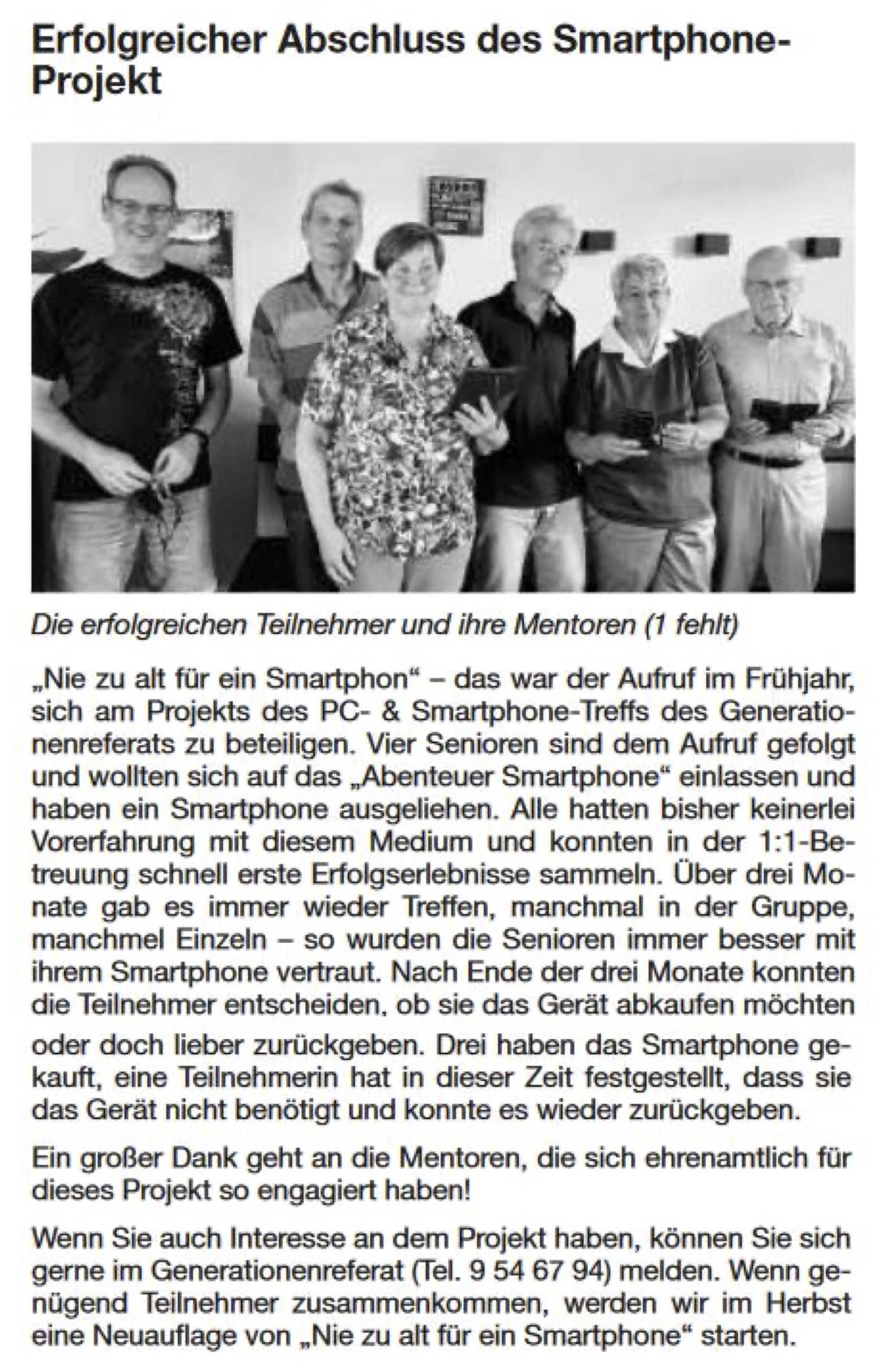 Bis auf eine Teilnehmerin, die vom Sohn ein Smartphone geschenkt bekam, haben alle anderen Teilnehmenden die Möglichkeit genutzt „ihr“ Gerät zum Selbstkostenpreis zu übernehmen. „Jetzt kenne ich das Gerät, warum soll ich ein anderes kaufen und wer richtet es mir dann ein?“