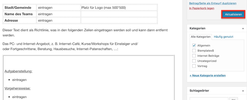 - Nach Abschluss der Eingabe die Änderungen mit einem Klick auf den Button „Aktualisieren“ speichern und veröffentlichen. Die Änderungen sollten jetzt für alle sichtbar sein. Eventuell muss der Cache des Browsers noch mit der Taste F5 aktualisiert werden.
