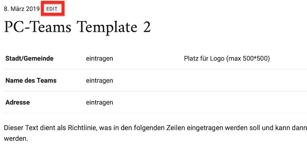 - Beim geöffneten Template mit einem Klick auf „Edit“ in den Editmodus gehen